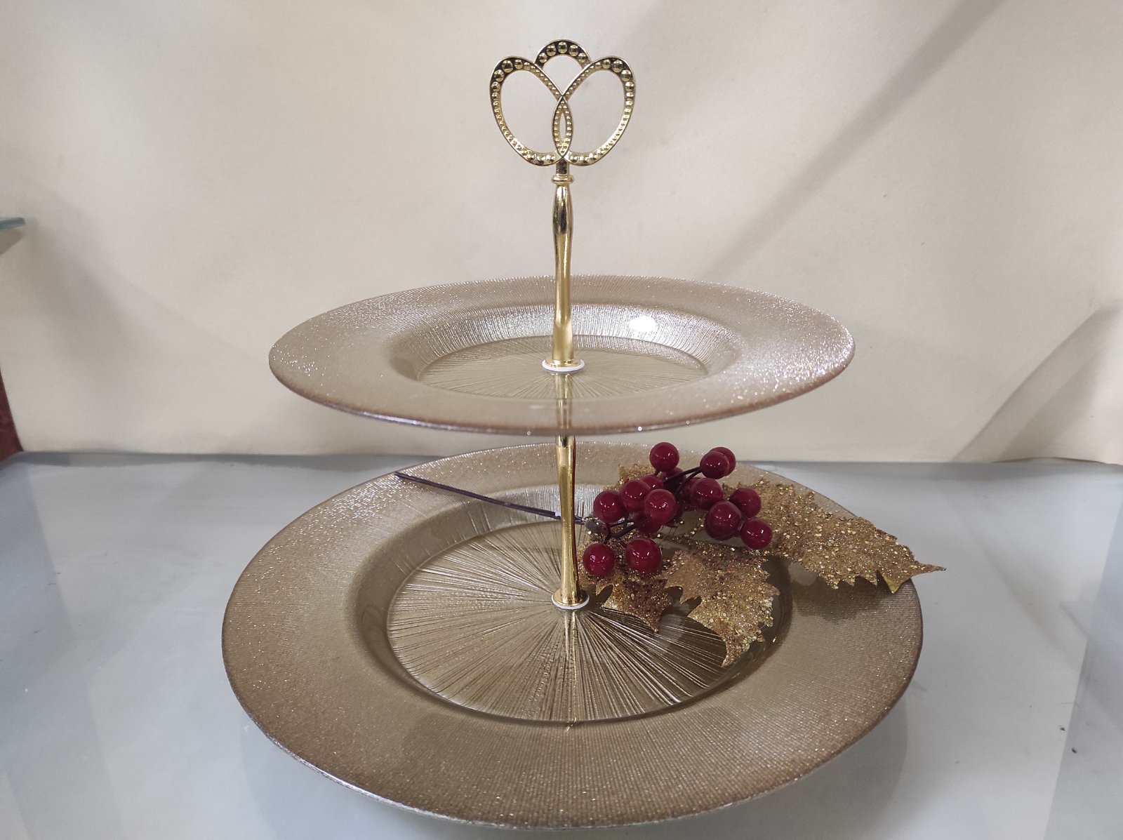 Χριστουγεννιάτικη διώροφη πιατέλα σε χρυσό χρώμα με μεταλλικό σκελετό