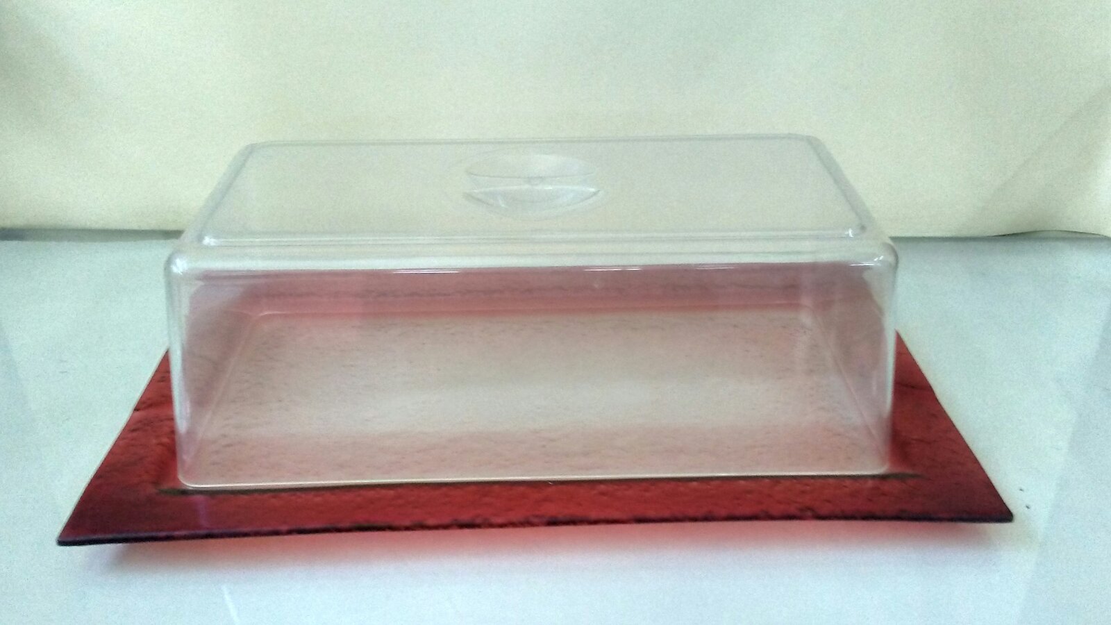 Γυάλινο πιάτο κέικ σε κόκκινο χρώμα.
