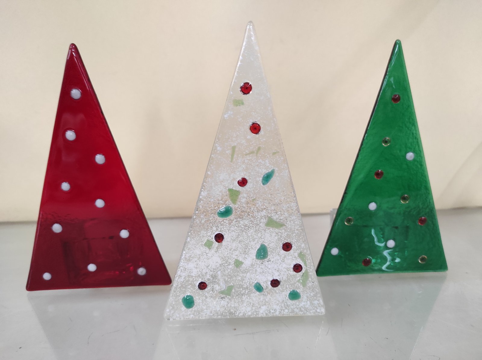 Γυάλινα χριστουγεννιάτικα δεντράκια ρεσώ σε κόκκινο, πράσινο και άσπρο χρώμα